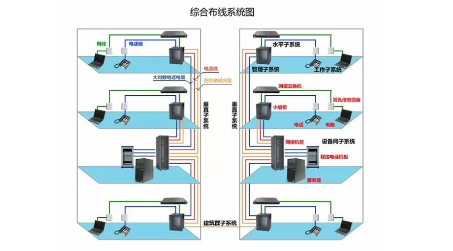 3)綜合布線系統(tǒng)由水平干線子系統(tǒng)、工作區(qū)子系統(tǒng)、垂直干線子系統(tǒng)、管理間子系統(tǒng)及設(shè)備間子系統(tǒng)構(gòu)成。