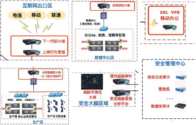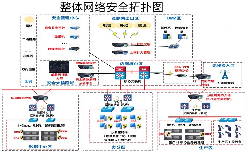 安全域劃分:集團網絡劃分成辦公網、研發(fā)網、生產網,數據中心網,通過下一代防火墻實現網絡的邏輯隔離和安全防護。