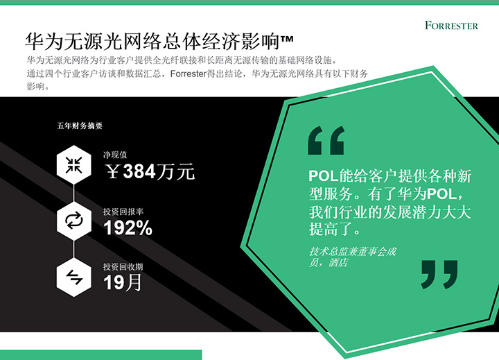 2022年上半年,華為委托權(quán)威咨詢公司Forrester進行了《華為無源光網(wǎng)絡總體經(jīng)濟影響™》研究。在本研究中,F(xiàn)orrester通過客戶訪談,以專有方法論分析部署華為無源光網(wǎng)絡(Passive optical LAN,POL)方案對企業(yè)帶來的經(jīng)濟影響。研究結(jié)果顯示,企業(yè)使用華為POL五年投資回報率達192%,投資回報周期為19個月。