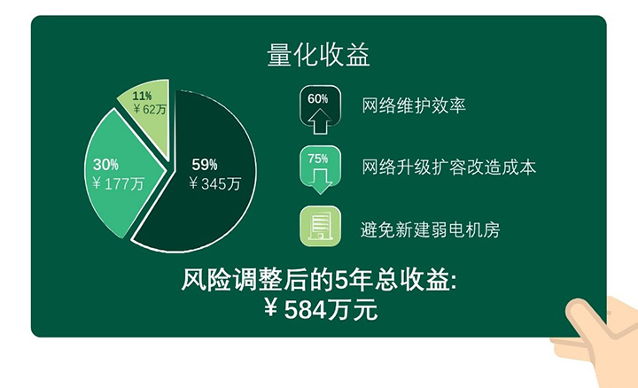 網(wǎng)絡運維成本:POL設備集中管理,全網(wǎng)統(tǒng)一運維;無源分光器點對多點傳輸減少維護節(jié)點,實現(xiàn)網(wǎng)絡維護效率60%提升,五年總收益現(xiàn)值超345萬元人民幣。