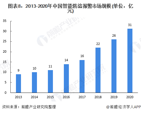 據中安網數據顯示,2020年我國安防行業總產值8510億元,其中安防產品總產值約為2600億元,結合防盜報警系統產值占安防產品總產值12%左右,根據我國智能防盜報警系統滲透率在10%左右測算,得出2020年我國智能防盜報警系統產值約為31億元。